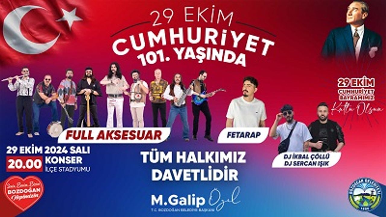 Başkan Özel yaptığı açıklamada, “Ulu önderimiz Gazi Mustafa Kemal Atatürk'ün bizlere emaneti, Cumhuriyetimizin 101’inci yılını hep birlikte kutlayacağız. Bu özel günü daha anlamlı hale getirmek ve Bozdoğan halkı olarak birlik ve beraberlik içinde kutlamak için düzenlediğimiz Cumhuriyet Konserimize tüm vatandaşlarımız davet ediyorum. 29 Ekim Salı akşamı saat 20.00’da buluşmak dileğiyle” ifadelerini kullandı.