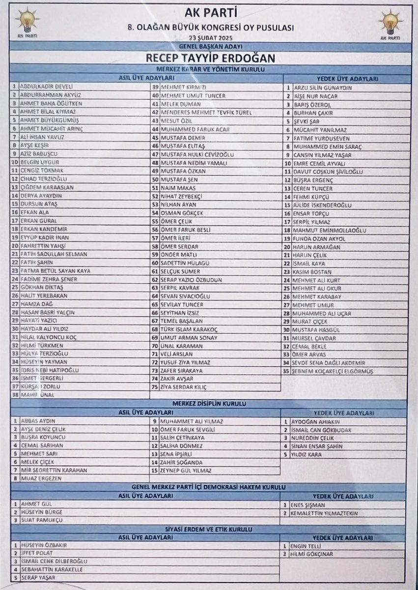 AK Parti’nin 8. Olağan Büyük Kongresi’nde Cumhurbaşkanı Recep Tayyip Erdoğan’ın 75 kişilik Merkez Karar ve Yönetim Kurulu (MKYK) listesi belli oldu.