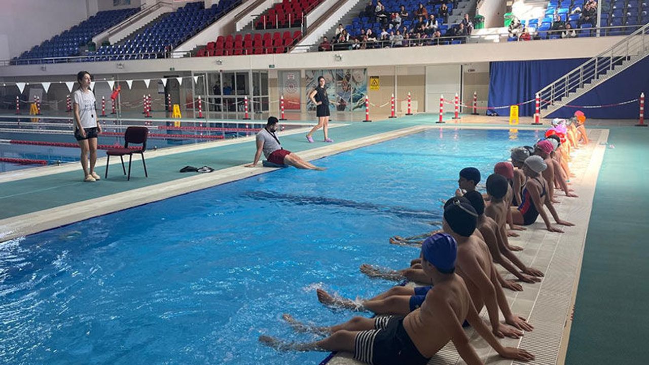 Aydın'ın Efeler ilçesindeki yarı olimpik yüzme havuzunda eğitimler devam ederken, minikler de hem yüzme öğreniyor hem de sporla buluşuyor.