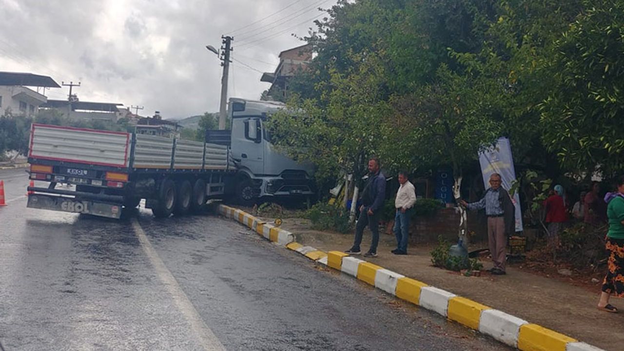Aydın'ın Bozdoğan ilçesinde meydana gelen trafik kazasında sürücüsünün direksiyon hakimiyetini kaybettiği TIR yoldan çıkarak kaldırıma çıkıp ağaçları devirdi.