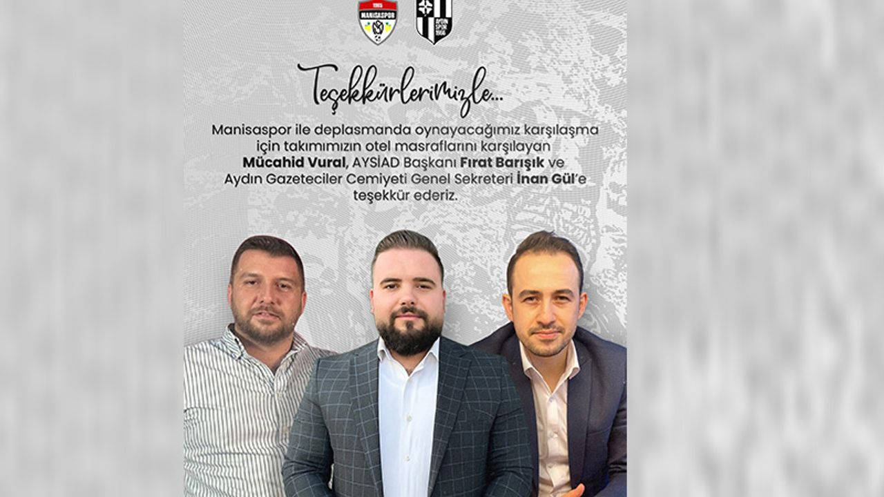Aydınspor yönetimi, sağlanan bu destek için üç isme de teşekkür etti. Kulüpten yapılan açıklamada, “Manisaspor ile deplasmanda oynayacağımız karşılaşma için takımımızın otel masraflarını karşılayan Mücahid Vural, AYSİAD Başkanı Fırat Barışık ve Aydın Gazeteciler Cemiyeti Genel Sekreteri İnan Gül’e teşekkür ederiz.” ifadeleri yer aldı.