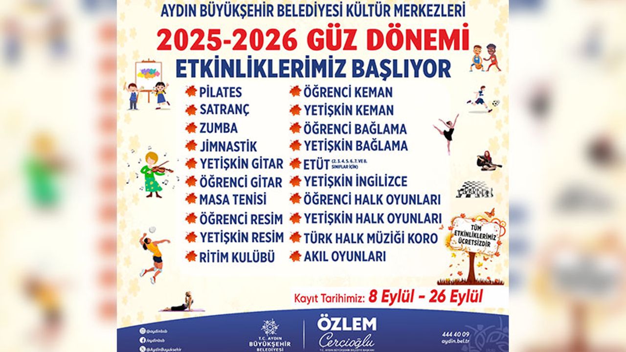 Büyükşehir Belediyesi tarafından geleneksel hale getirilen “Güz Dönemi Etkinlikleri” için kayıtlar başladı. Vatandaşlara zumba, pilates, satranç, jimnastik, resim, gitar ve keman gibi farklı alanlarda eğitimler sunulacak. Büyükşehir Belediyesi’nin eğitime destek çalışmaları ile Aydınlılar yeni eğitim-öğretim dönemini hem verimli hem de eğlenceli bir şekilde geçirecek. Alanında uzman eğitmenler eşliğinde gerçekleşecek kurslar sayesinde çocuklar, gençler ve yetişkinler hem sağlıklı yaşam alışkanlıkları kazanacak hem de yeni yeteneklerini keşfetme imkânı bulacak.