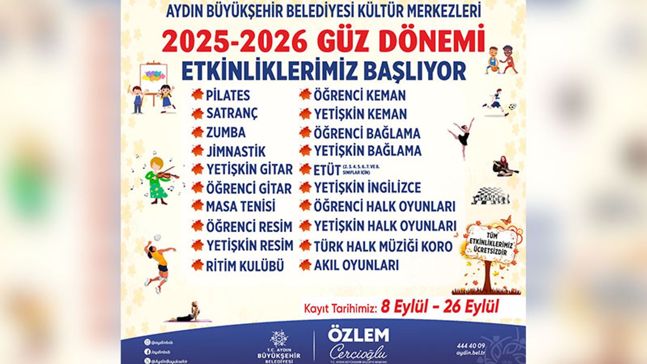 Büyükşehir Belediyesi tarafından geleneksel hale getirilen “Güz Dönemi Etkinlikleri” için kayıtlar başladı. Vatandaşlara zumba, pilates, satranç, jimnastik, resim, gitar ve keman gibi farklı alanlarda eğitimler sunulacak. Büyükşehir Belediyesi’nin eğitime destek çalışmaları ile Aydınlılar yeni eğitim-öğretim dönemini hem verimli hem de eğlenceli bir şekilde geçirecek. Alanında uzman eğitmenler eşliğinde gerçekleşecek kurslar sayesinde çocuklar, gençler ve yetişkinler hem sağlıklı yaşam alışkanlıkları kazanacak hem de yeni yeteneklerini keşfetme imkânı bulacak.