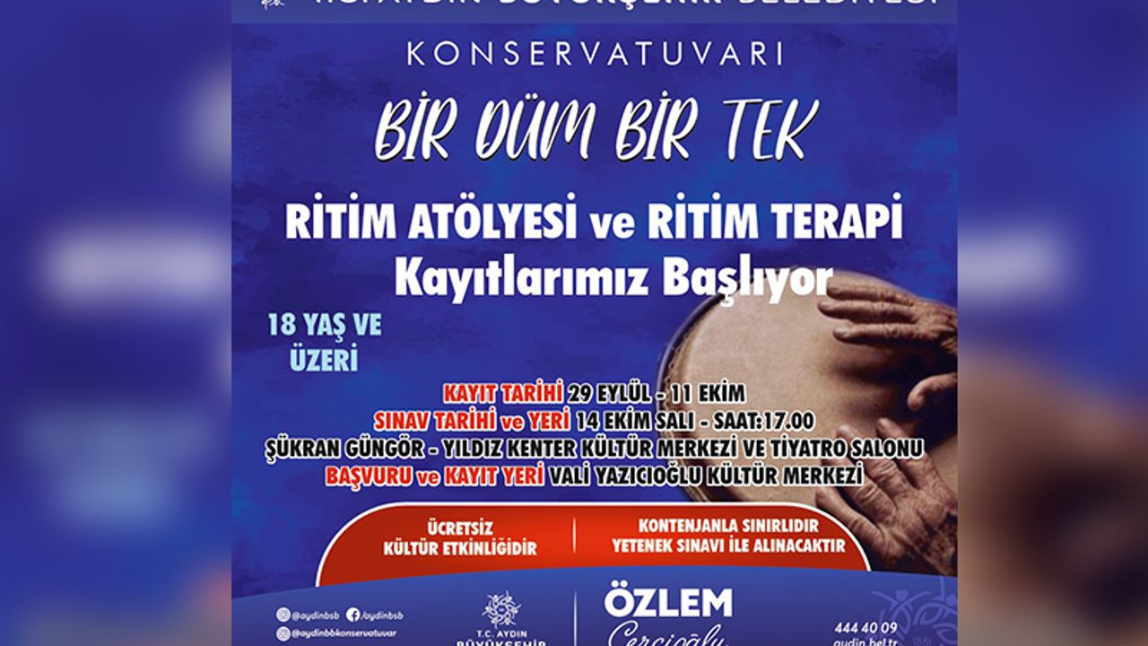 Aydın Büyükşehir Belediyesi Konservatuvarı, Aydınlıların çok sevdiği ve yoğun ilgi gösterdiği "Bir Düm Bir Tek" ritim atölyesi ile ritim terapisi eğitimlerinde yeni dönem kayıtlarını başlatıyor.