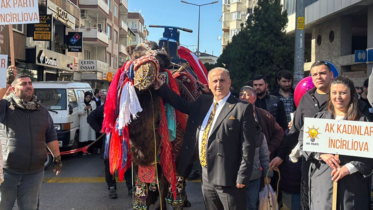 İncirliova Belediye Başkanı Aytekin Kaya, Cumhurbaşkanı Recep Tayyip Erdoğan’ın Aydın’da yapacağı toplu açılış tören alanına develer eşliğinde kalabalık bir grup ile geldi.