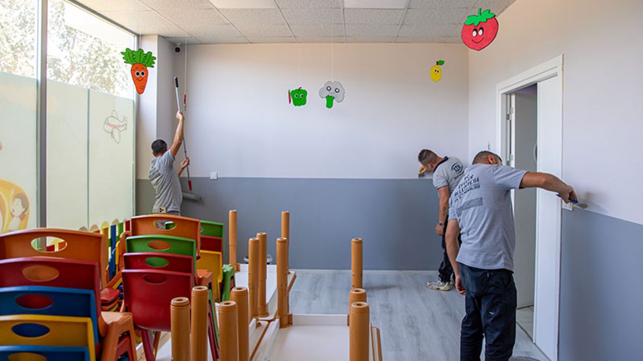 Yaz tatili süresince Fen İşleri Müdürlüğü ekipleri tarafından duvarlar boyanıyor, yıpranan alanlar yenileniyor ve merkezler daha ferah, modern bir görünüme kavuşturuluyor.