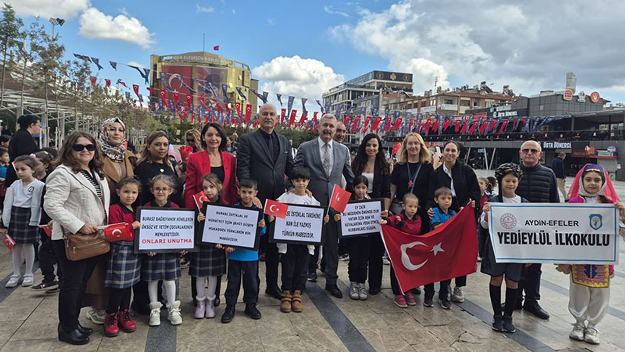 Şehitler Anıtı ziyaretine, Türk bayraklarıyla ve kitabedeki yazıları içeren pankartlarla gelen öğrencilere, Aydın’ın kurtuluşu ve anıtın tarihi önemi hakkında bilgi verildi.