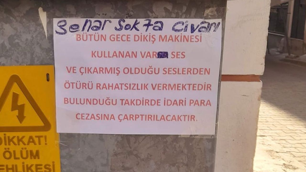 Aydın'ın Söke ilçesinde mahalle sakinleri gece saatlerinde dikiş makinesi kullanarak gürültü yaptığı iddia edilen kişiyi afişle uyardı.