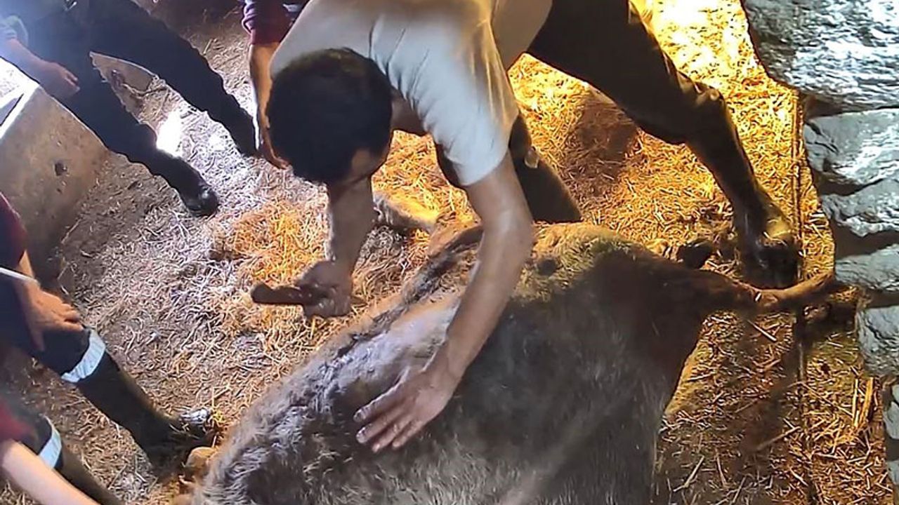 Önce ineğin sağ boşluğundaki kıllarını yülüyen S.T. daha sonra eline aldığı ekmek bıçağı ile ineği herhangi bir anestezi uygulamadan ameliyat etmeye başladı. Acı içinde inleyen ineğin sağ boşluğunu ekmek bıçağı ile kesen kişi daha sonra buzağıyı ineğin karnından çıkardı. Talihsiz hayvan daha sonra telef oldu.