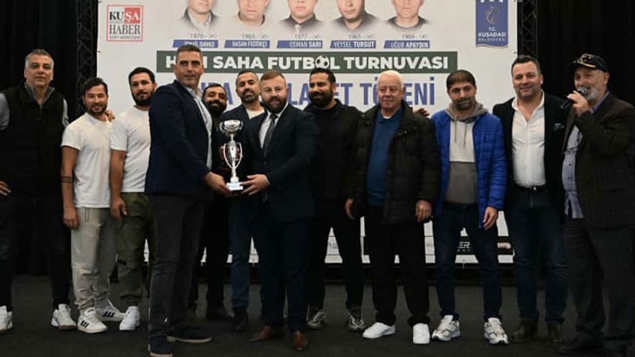 Kuşadası’nda kanalizasyon terfi istasyonunda 2015 yılında meydana gelen kazada, metan gazı zehirlenmesi sonucu görevleri başında hayatlarını kaybeden İsmail Davas, Hasan Fıstıkçı, Osman Sarı, Veysel Turgut ve Uğur Apaydın için ‘Kuşadası Belediyesi Görev Şehitleri Halı Saha Futbol Turnuvası’ düzenlendi. Kuşadası Belediyesi ve KUŞA Haber işbirliğinde gerçekleştirilen organizasyona 8 takım katıldı. Turnuvada dereceye giren takımlar ile organizasyona destek olan firmalara kupa ve plaketleri Pera Kültür, Düğün ve Organizasyon Merkezi’nde düzenlenen törenle Kuşadası Belediyesi Meclis üyeleri Mehmet Sarıdedeoğlu ve Tahsin Demirtaş tarafından verildi. Ödül töreni toplu fotoğraf çekiminin ardından sona erdi.