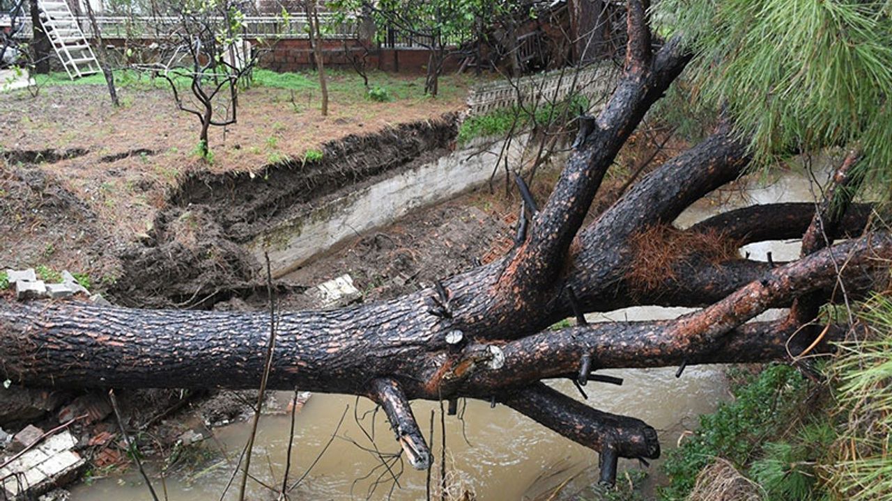 Güzelçamlı Mahallesi’nde günlerdir süren yağışlar nedeniyle köklerinden koparak dere yatağına devrilen çam ağacı, köprü ve yolda maddi hasara yol açtı.