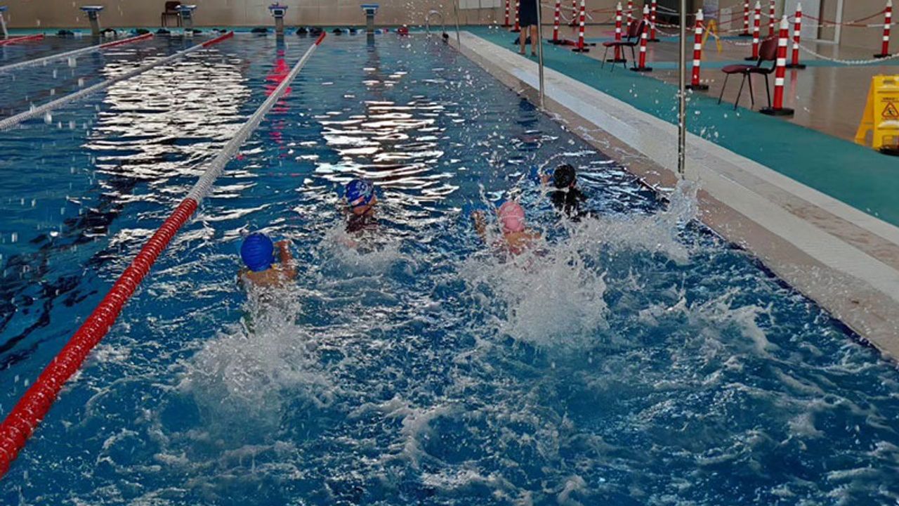 Yarı olimpik yüzme havuzunda düzenlenen eğitimlerle öğrenciler, profesyonel antrenörler eşliğinde yüzme öğreniyor.