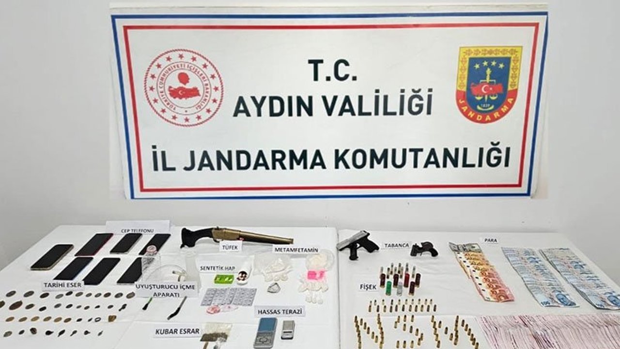 Aydın İl Jandarma Komutanlığı Narkotik Suçlarla Mücadele Şube Müdürlüğü ve Söke İlçe Jandarma Komutanlığı ekiplerince, 24 Mart 2026 günü Söke ilçesinde yürütülen çalışmalar kapsamında uyuşturucu ve tarihi eserlere yönelik operasyon düzenlendi. Operasyonda, şüphelilerin ikametlerinde yapılan aramalarda; 180 gram metamfetamin, 20 gram esrar, 60 adet sentetik ecza hapı, 2 adet hassas terazi, 3 adet bong aparatı, 2 adet tabanca, 1 adet kırma av tüfeği, 93 adet tabanca fişeği, 55 bin TL nakit para ile birlikte 10 adet tarihi para, 19 adet sikke, 13 adet tarihi obje, 1 adet tarihi yüzük ve Bizans dönemine ait 1 adet tarihi eser ele geçirildi. Ayrıca 6 adet cep telefonuna da el konuldu.