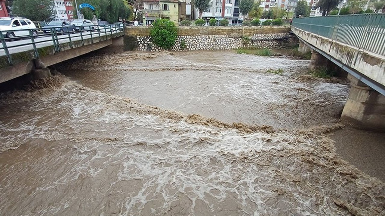 Aydın'ın merkez ilçesi Efeler'de etkili olan sağanak yağışın ardından yağmur suları Tabakhane Deresi'ni coştururken, derede su seviyesi yükseldi.